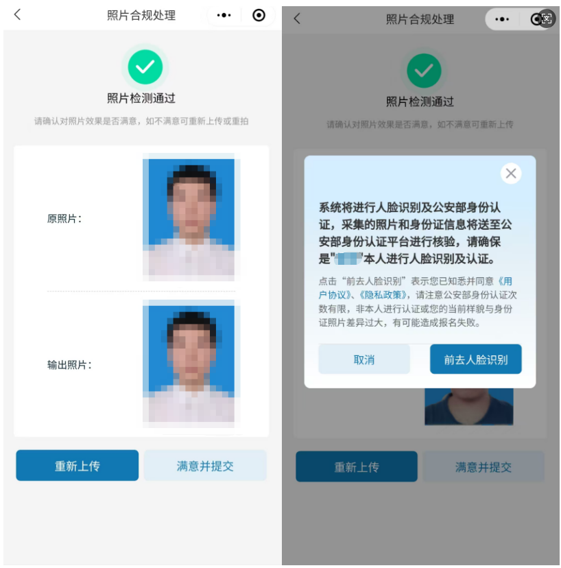 5)确认提交:照片合格后,页面将显示“原照片”及处理后的“输出照片”。若对照片满意请点击“满意并提交”按钮完成提交。若不满意,可继续点击“重新上传”按钮重新选择其他照片。