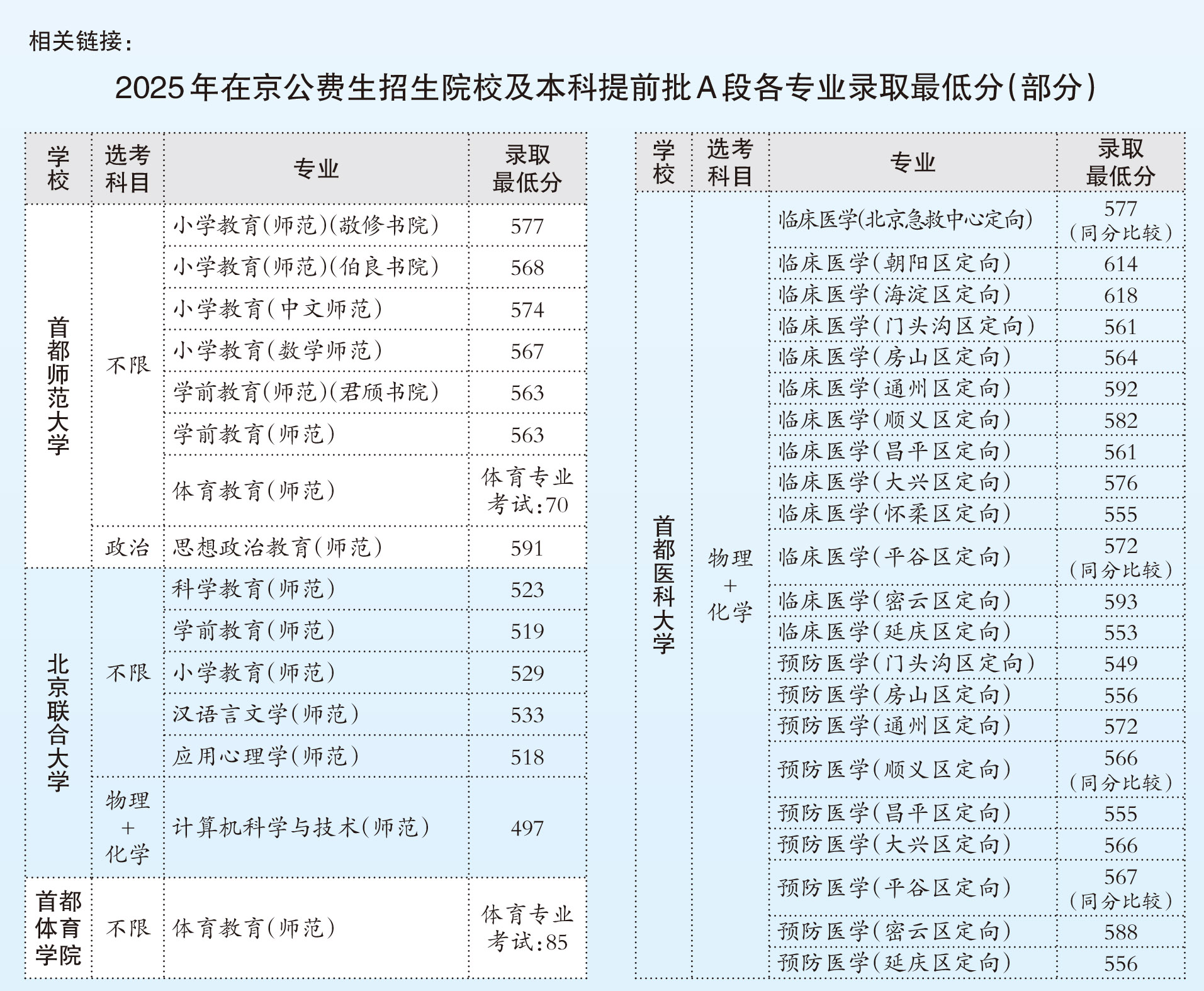 首都医科大学定向就业专业均在本科提前批A段招生录取。在报考条件上,临床医学专业(北京急救中心定向)只招北京市户籍的考生,且选考科目须选择物理和化学。北京郊区定向的临床医学专业和预防医学专业只招收定向单位所在区户籍的考生,不得跨区报考,选考科目须选择物理和化学。此外,在北京市2025年普通高等学校招生专业目录中,首都医科大学明确标明,该校本科定向就业的专业不招色盲、色弱、单色识别能力异常以及斜视、弱视等考生。