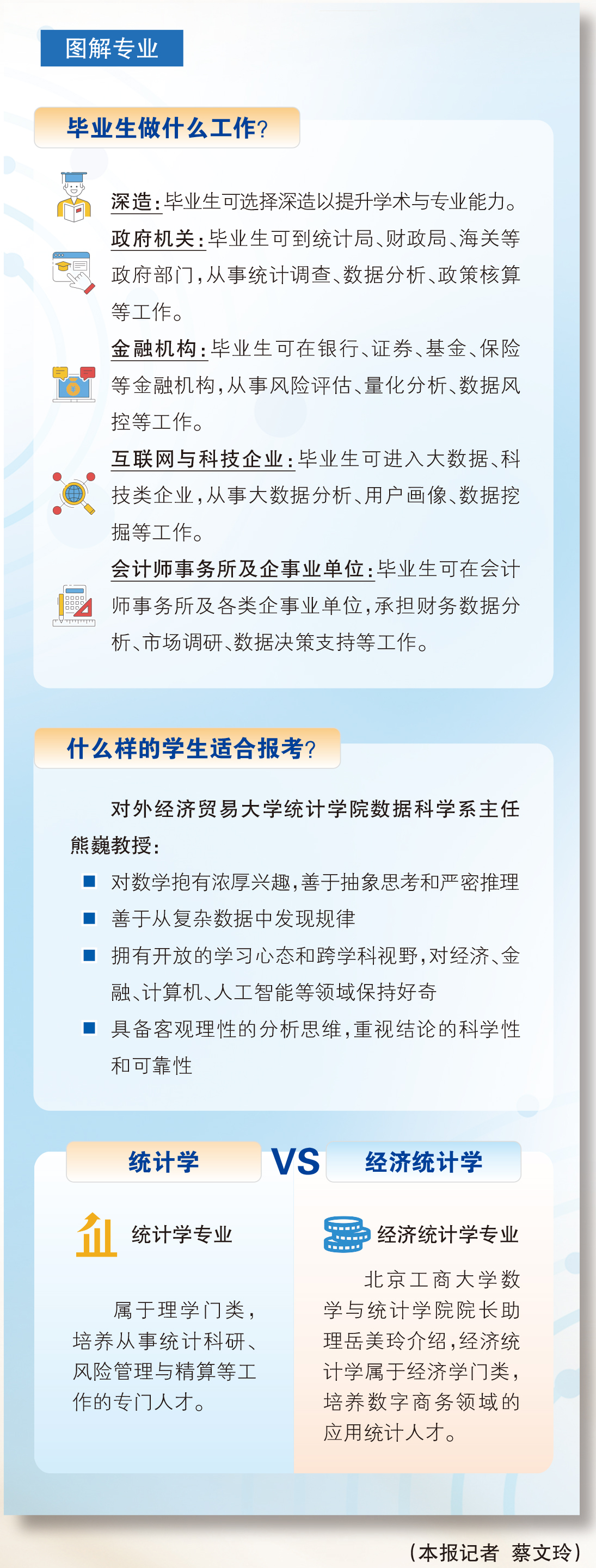 对外经济贸易大学统计学院依托财经类学科和国际化优势,精心打造两个方向清晰、优势互补的专业:经济统计学和统计学。该校数据科学系主任熊巍介绍:“经济统计学专业致力于培养懂数据的‘财经翻译官’,学生可运用统计方法研究经济学与金融学前沿问题,从事经济预测与政策研究。统计学专业则着力培养‘数据科学家’,为人工智能及多领域输送算法工程师与统计理论研究人才。”