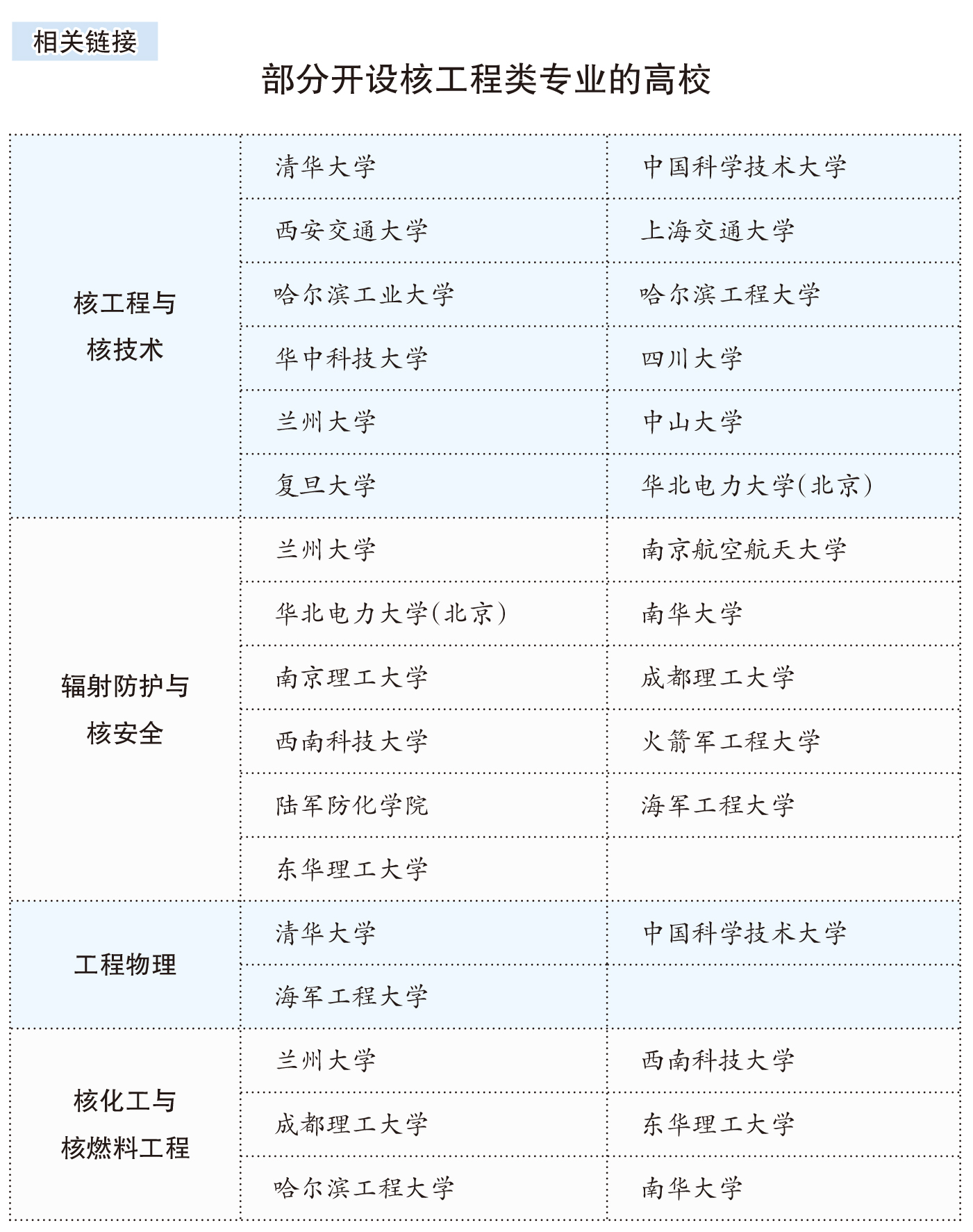 干什么:毕业生主要在核电站、医院放射科、环保部门、核安全监管机构等单位工作,可从事辐射防护、核安全管理、辐射监测、环境影响评价等工作;也可在科研院所从事辐射防护技术研究;或在涉核企业担任安全管理人员。