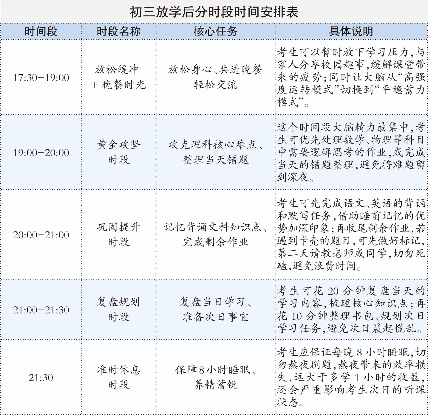 放学后的时间是初三生“查漏补缺、巩固提升”的黄金时段。因此,笔者建议考生将放学回家后的时间合理分段安排,这样既能抓学习效率,又能避免过度疲劳。